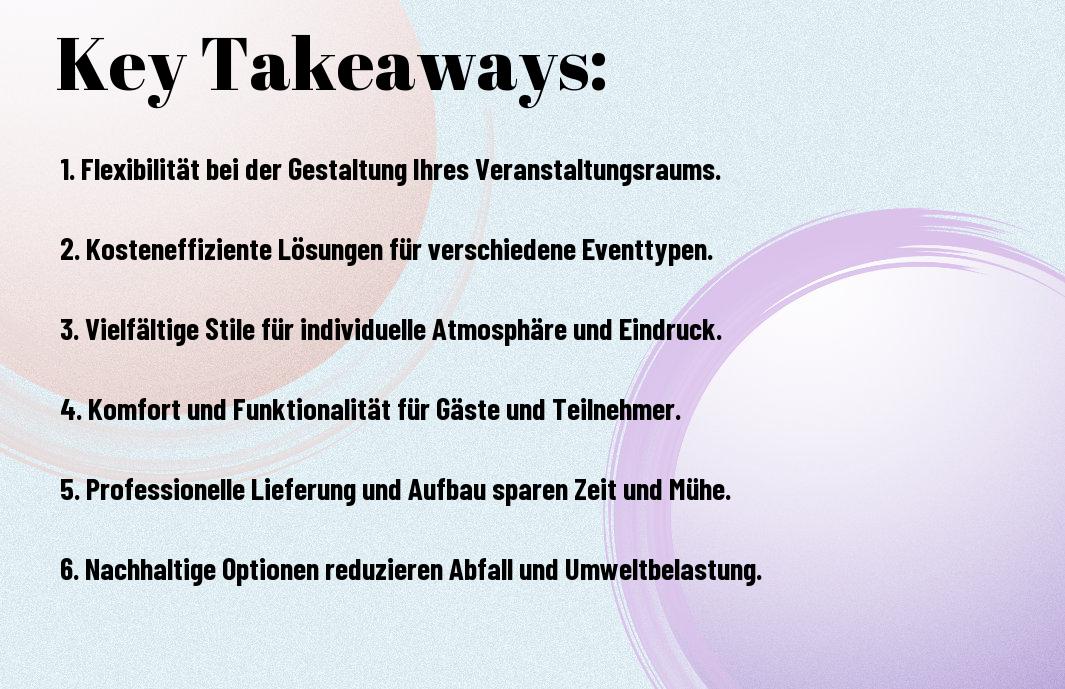 Durch die Inanspruchnahme von Mietservices können Sie sich auf einen reibungslosen Ablauf verlassen. Viele Anbieter bieten Lieferung und Aufbau der Möbel an, wodurch Sie wertvolle Zeit und Mühe sparen. So können Sie sich auf andere wichtige Aspekte Ihrer Veranstaltung konzentrieren, während Fachleute sich um die Einrichtung kümmern.