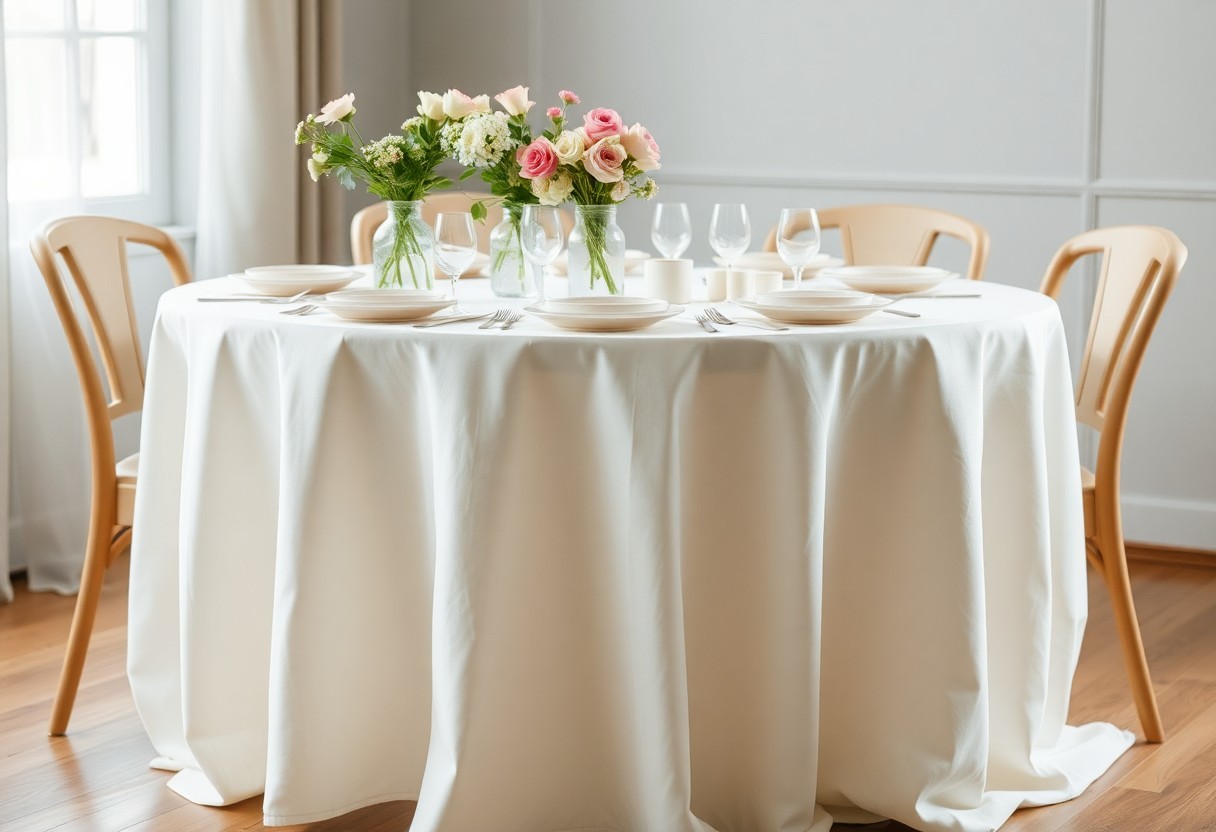 Tische können mit einem runden Leinentischtuch in Offwhite dekoriert werden, um eine helle und freundliche Atmosphäre zu schaffen. Du kannst es mit deiner Lieblingskeramik und deinem besten Glas kombINIEREN, um eine elegante Tischsetzung zu erstellen.