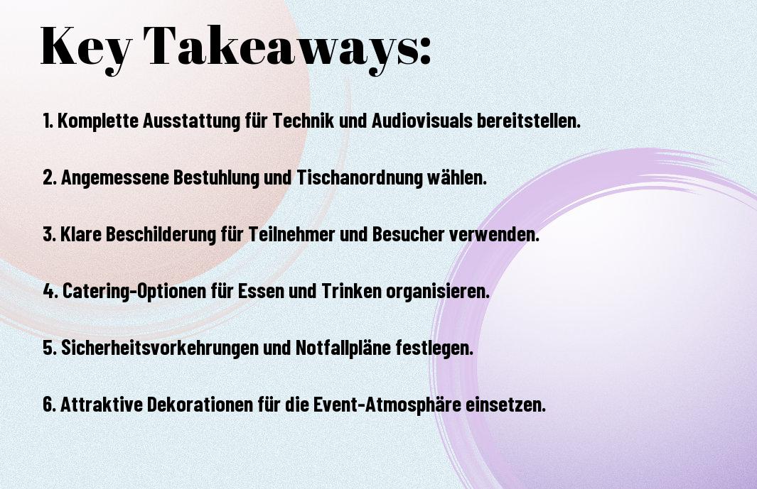 Um Ihr Event erfolgreich zu gestalten, sollten Sie essenzielle Elemente in Ihr Setup integrieren. Dazu gehören eine sorgfältige Planung des Raums, angemessene Technik, wie Mikrofone und Projektoren, sowie komfortable Sitzgelegenheiten für Ihre Gäste. Achten Sie auch auf ansprechende Dekoration und ausreichend Verpflegung, um eine angenehme Atmosphäre zu schaffen. Vergessen Sie nicht, ein Verkabelungsmanagement zu planen, um Stolperfallen zu vermeiden. Indem Sie diese Elemente berücksichtigen, stellen Sie sicher, dass Ihr Event reibungslos verläuft und Ihre Teilnehmer begeistert sind.