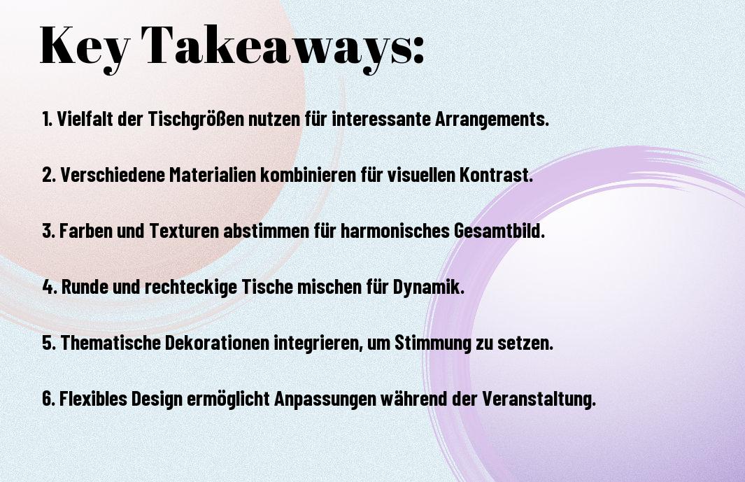 Wenn Sie eine unvergessliche Veranstaltung planen, kann die Kombination verschiedener Tische zu einem einzigartigen Ambiente beitragen. Durch die geschickte Auswahl von Grössen, Formen und Materialien können Sie eine dynamische und einladende Atmosphäre schaffen. In diesem Beitrag erfahren Sie, wie Sie unterschiedliche Tischtypen optimal miteinander kombinieren, um Ihrer Veranstaltung einen individuellen und kreativen Touch zu verleihen. Lassen Sie sich inspirieren und entdecken Sie die Möglichkeiten, die Ihnen zur Verfügung stehen!
